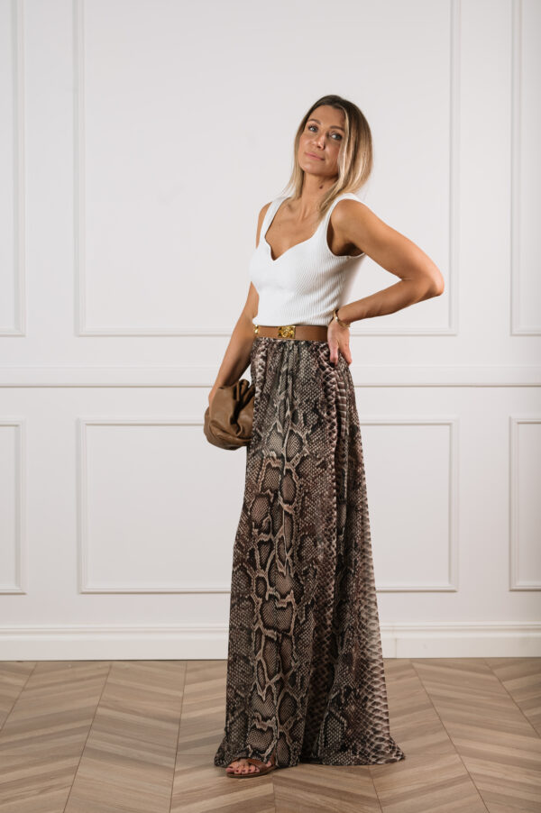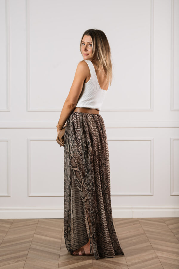 Elie Saab on tuntud oma luksuslike ja naiselike loomingute poolest ning see siidist georgette maxi-seelik ei ole erand. Efektne ussinaha muster ja graatsiliselt langev kangas loovad julge, kuid samas elegantse välimuse. Kahe sügava lõhiku ja lühikese voodriga seelik paljastab liikumisel kaunilt jalgu, lisades igale sammule sensuaalsust. See on pilkupüüdev valik nii õhtusele üritusele kui ka stiilseks statement-look’iks päevasel ajal.