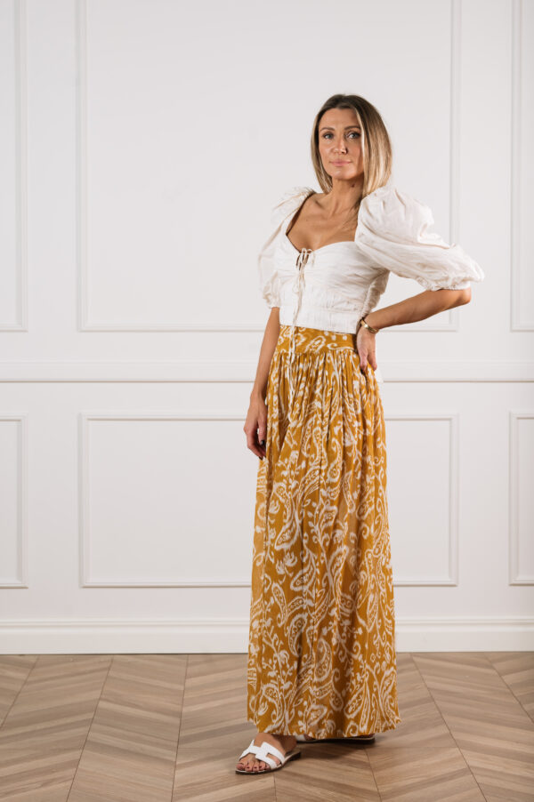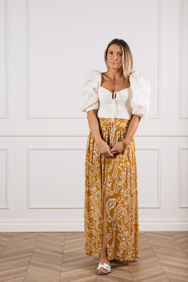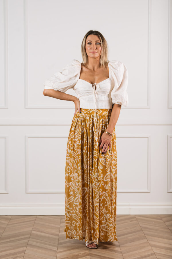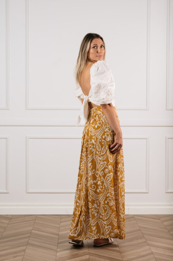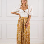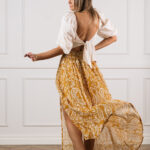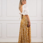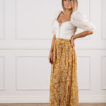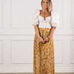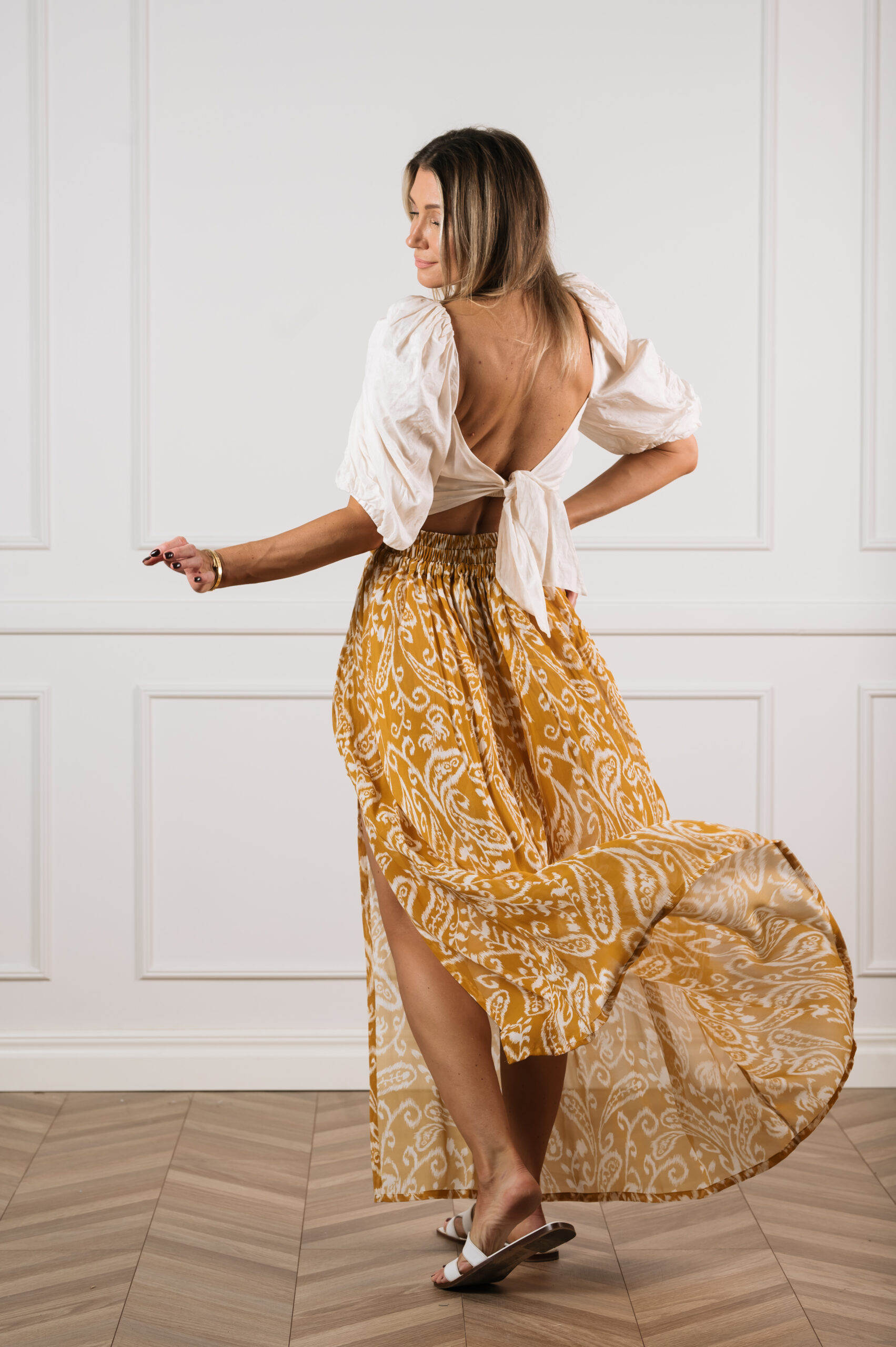 See on suvine statement-komplekt, mis ühendab luksusliku siidi ja romantilise puuvilla. Evarae orgaanilisest siidist maksiseelik lummab oma voogava liikumise ja päikesekollase paisley-mustriga, samas kui Johanna Ortiz “Garua” crop-pluus lisab komplektile ladinaameerikalikku sensuaalsust ja arhitektuurset vormi. See kooslus sobib ideaalselt suveõhtuseks sündmuseks, puhkuseõhtusöögiks või eriliseks tähistamiseks.