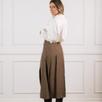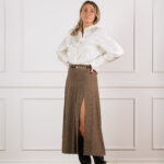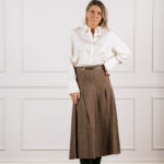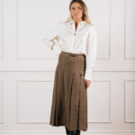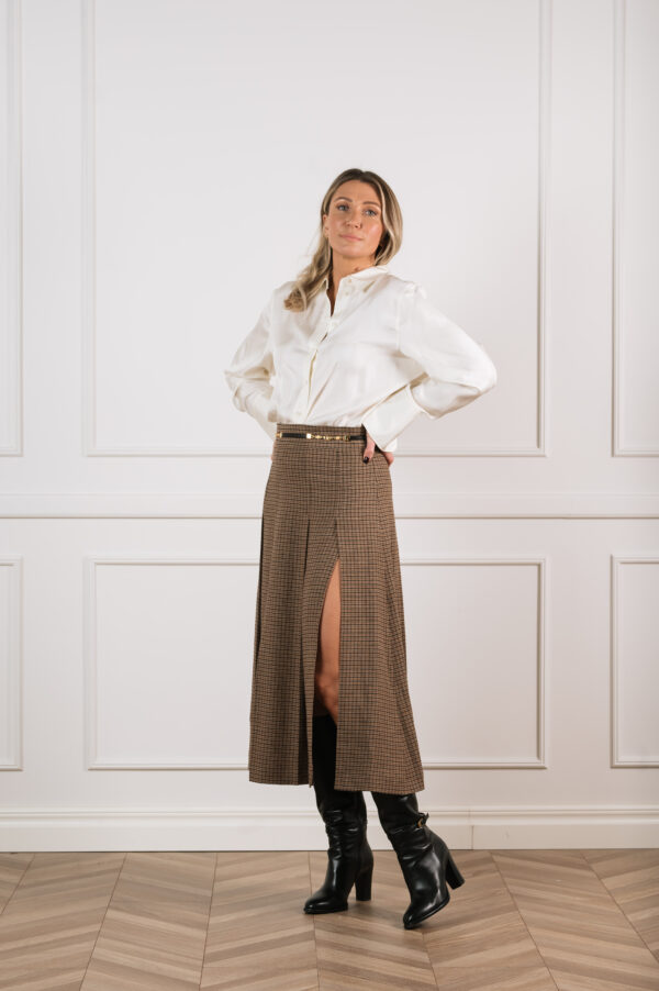 Gucci pruun ruuduline linane seelik on ajatult šikk garderoobiklassika, mis ühendab Itaalia moemaja rafineerituse ja loomuliku kandmismugavuse. Kergest ja hingavast linasest kangast valmistatud midi-pikkune seelik langeb kaunilt, samal ajal kui volditud detailid loovad pehme liikumise ja elegantse silueti. Pilkupüüdev kuldne ketivöö ikoonilise logoga lisab disainile luksusliku aktsendi, rõhutades vöökohta peenelt ja naiselikult.