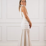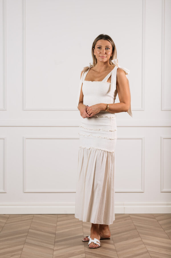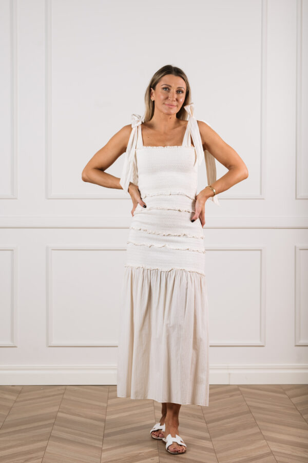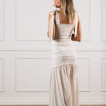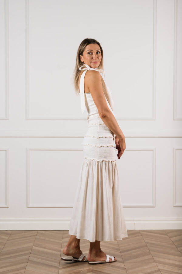 LoveShackFancy Lemon Meringue midi-kleit on tõeline romantilise suve unistus. Õrn helekollane triip valgel taustal loob värske ja naiseliku meeleolu, mis sobib ideaalselt päikeselisteks päevadeks ja puhkusereisideks. Kleidi ülaosa on veniv ja kehasse vormuv, pakkudes mugavat ning kaunist istuvust, samal ajal kui alt avaram seelikuosa langeb õrnalt ja liikudes voogavalt.